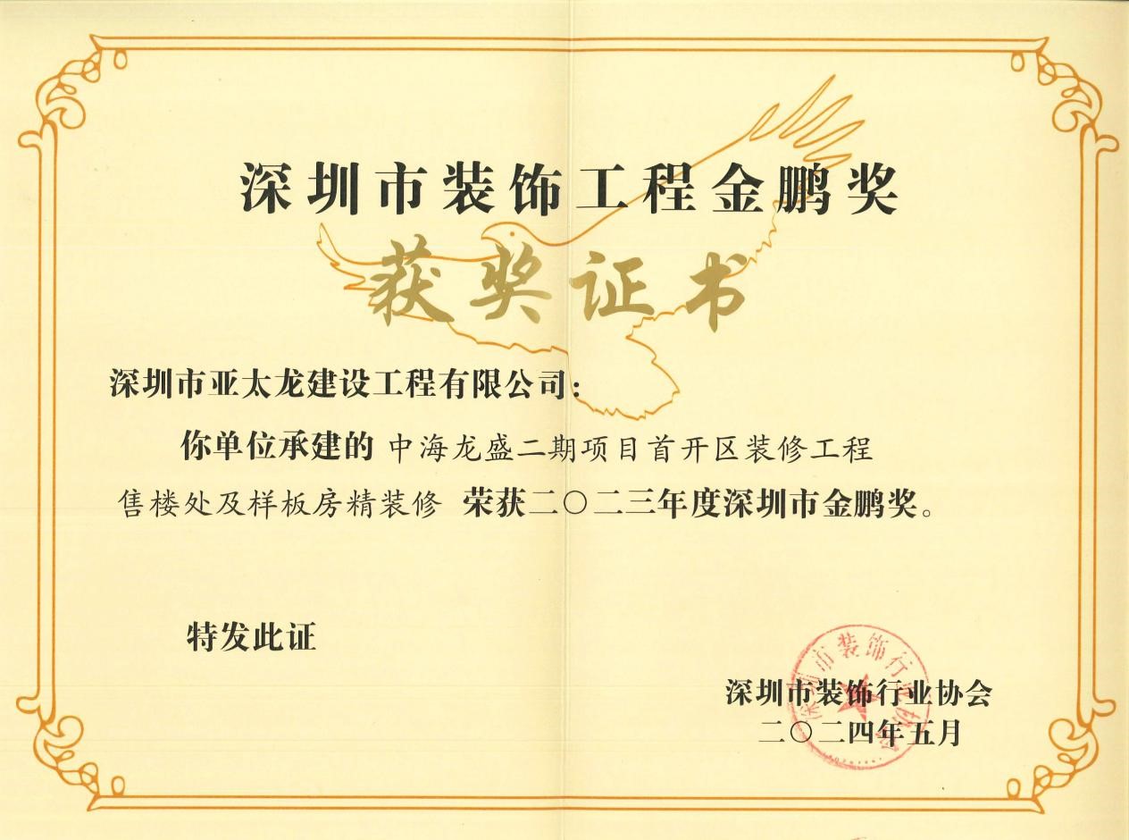 2023年深圳市装饰工程金鹏奖—中海龙盛二期项目首开区装修工程