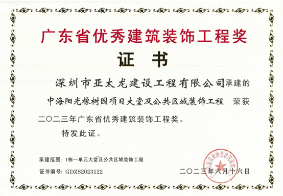 广东省优秀建筑装饰工程奖—中海阳光橡树园项目大堂及公共区域装饰
