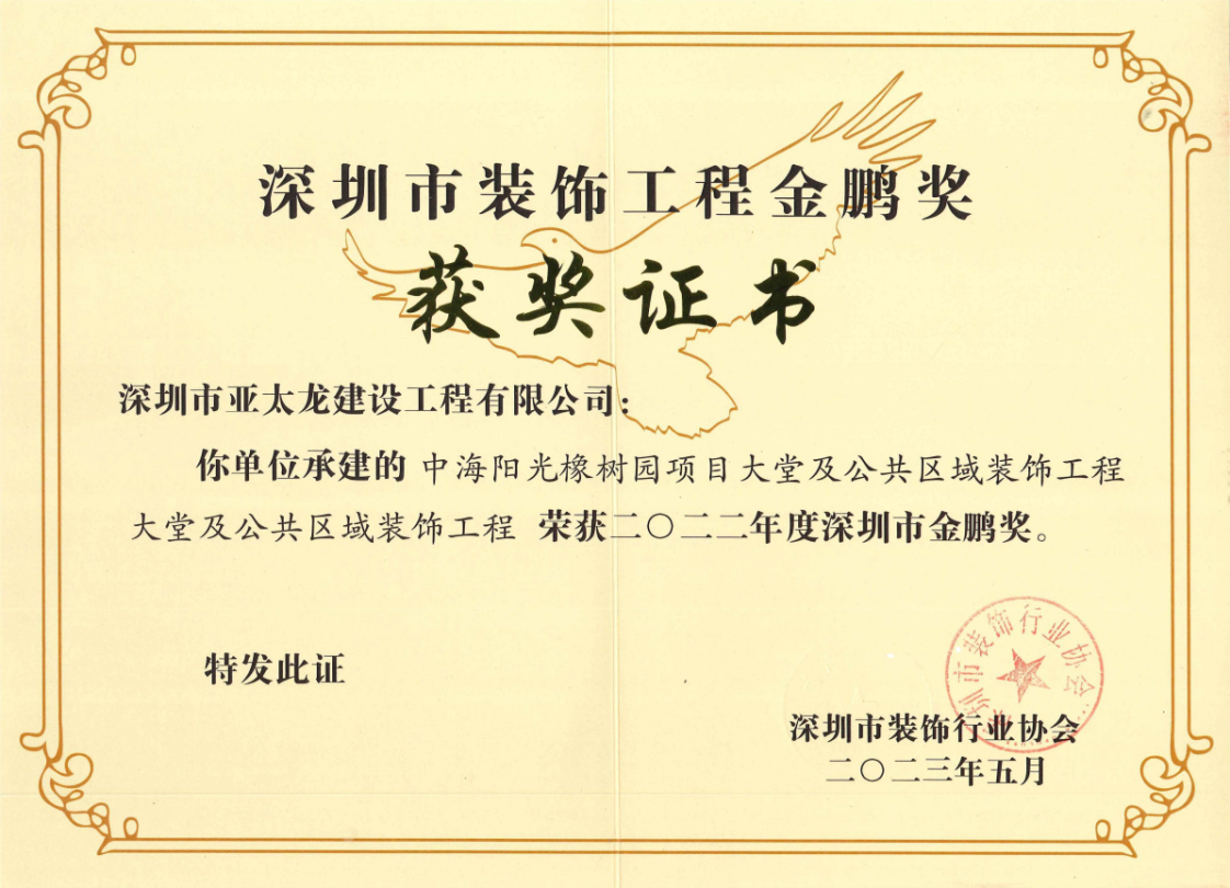 2022年深圳市装饰工程金鹏奖—中海阳光橡树园项目大堂及公共区域装饰