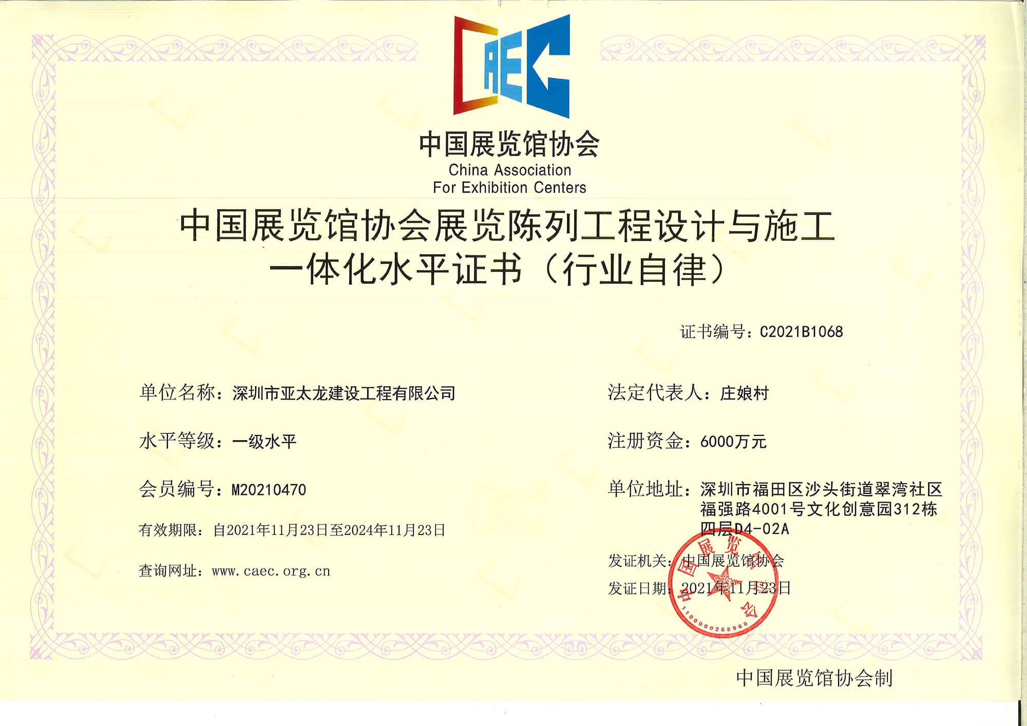 中国展览馆协会展览陈列工程设计与施工一体化水平证书(正本)