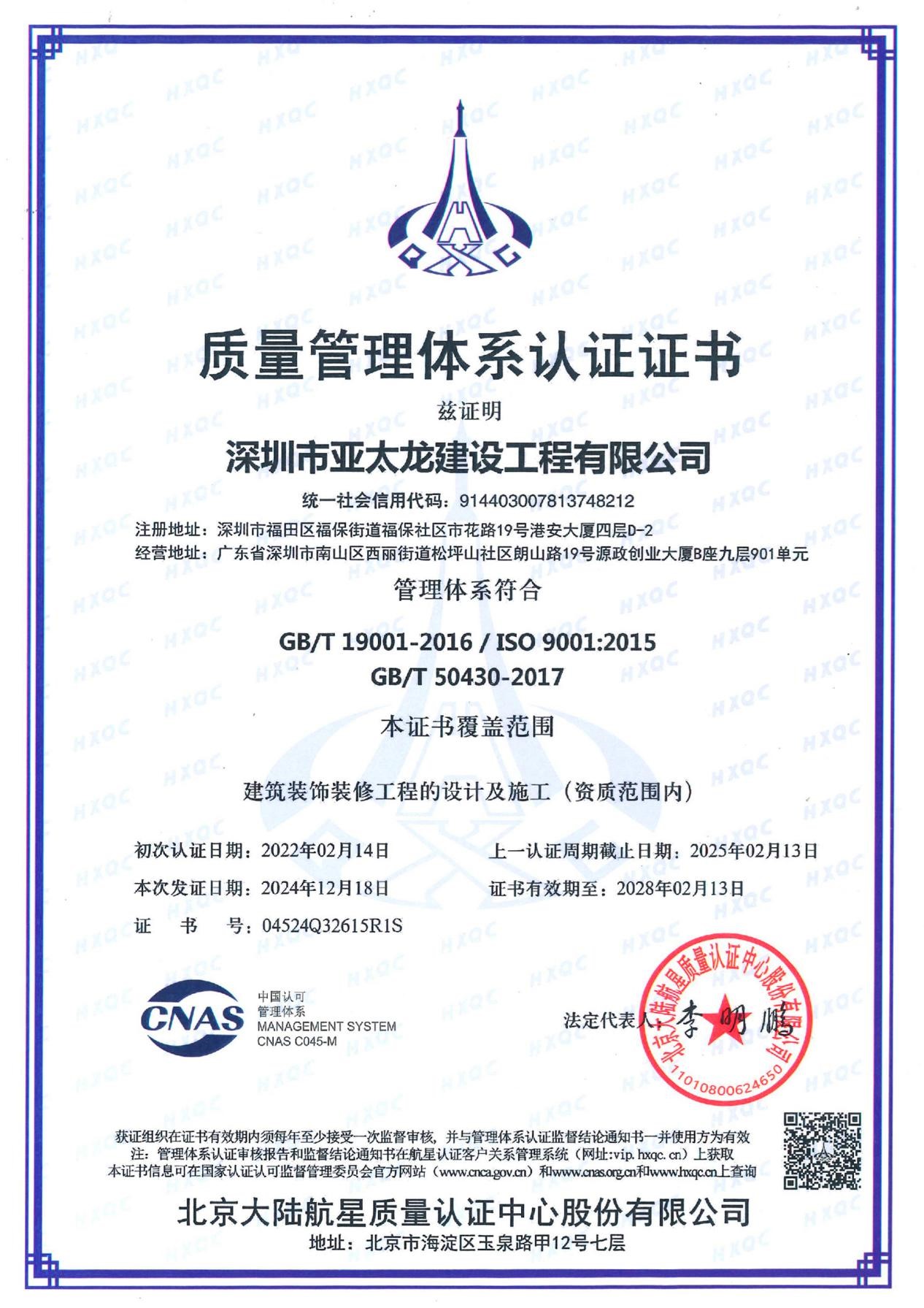 质量管理体系认证证书