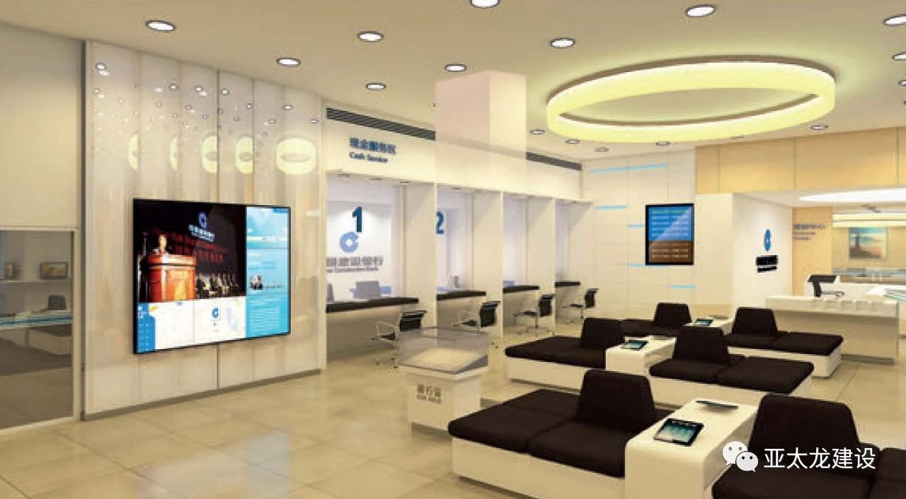 亚太龙建设按照建设银行营业网点建设指引的要求,在“蓝色银行”的基础上,对外部环境系统、内部环境系 统、营销宣传系统、指示系统等区域精雕细琢,把握好 材料、照明、进度、质量、安全等各个环节,抢工期、保质量,圆满完成施工任务,为建设银行营造一个温馨、时尚、智慧的营业网点。