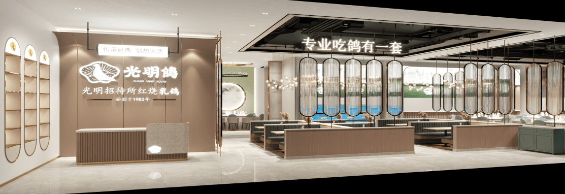 1983年,光明招待所在光明这片土地诞生,承载了一代深圳人的对光明乳鸽集体味觉记忆与青春,今天的深圳欢乐海岸, “光明鸽城市主题餐厅”在万众期待中顺势而生。作为光明招待所数十年发展演化而来的全新面孔,光明鸽汲取了深圳城市发展的新锐灵感,传承老字号经典的同时,融入城市生活新时尚的元素,探索传统鸽膳食文化与现代空间艺术相结合的更多可能性。